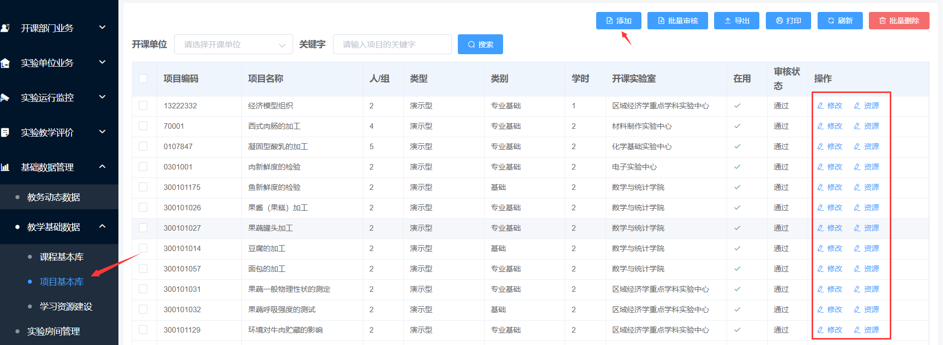 3.系统中基础数据包括实验场所基本信息、实验课程基本信息、实验项目信息等延续上学期系统中维护好的数据,如需新增实验场所信息需填写《实验室信息统计表》(见附件1)上交教务部实践教学科进行统一添加管理,新增实验项目各任课教师可自行在实验项目库进行新增如图1。(实验项目编号是学校编码10110+实验室编码+三位流水号,按照现有项目往下继续编号)